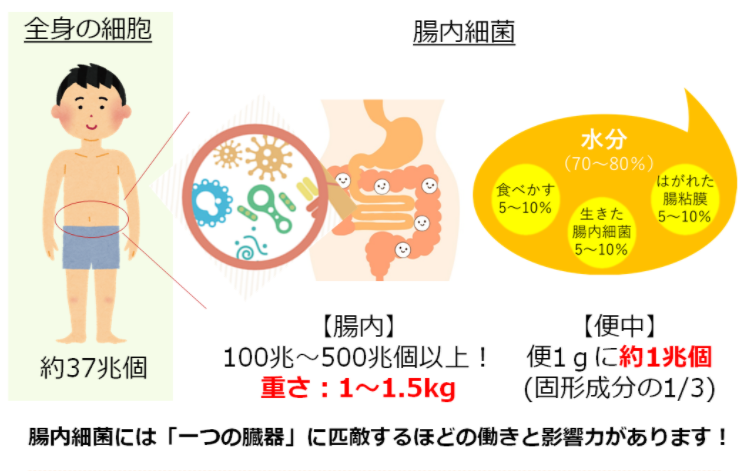 その数は細胞の2倍以上です。これら腸内細菌叢の重さはなんと1㎏にも。