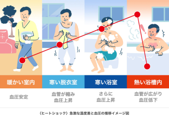 暖かい居室から、冷えた脱衣所に行って服を脱ぐと血管が収縮して血圧が上昇し、その後に浴室で湯につかると血管が拡張して血圧が下がる。